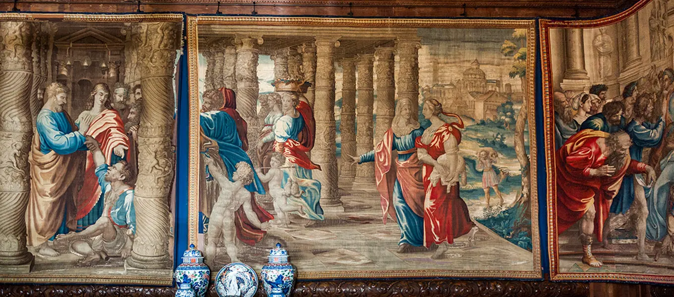 The Mortlake Acts of the Apostle tapestries date to the mid 1630s, and were woven from designs by the Renaissance artist Raphael (1483-1520), originally designed for tapestries which decorate the Sistine Chapel in the Vatican. We do not know when the tapestries were moved to this location but we do know the 6th Duke reframed them in the 1830s. In 2014 a major conservation project was begun to repair and protect these important pieces of English weaving.