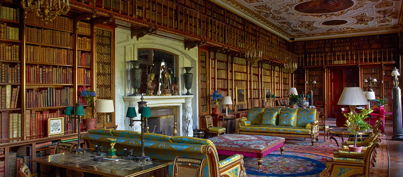 The furniture in the Library comes from many different family houses. The four book tables, two at each end of the room, were designed by William Kent for the Library at Chiswick. The large suite of seat furniture attributed to Morel and Hughes was brought from the Saloon at Devonshire House. In 2013, it was restored and reupholstered with a reweave of the original turquoise and gold silk brocade.