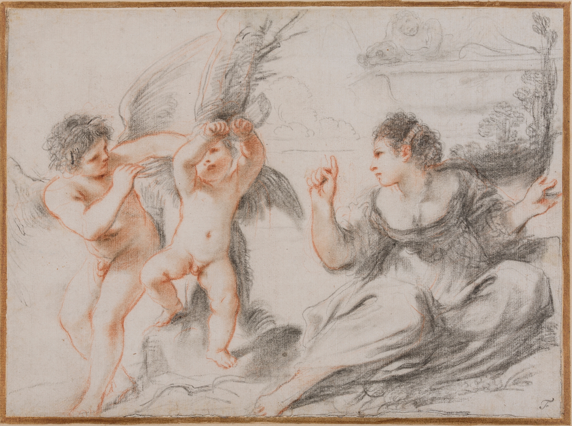 Venus scolding Cupid, while an older cupid binds him to a tree, pen and brown ink on faded blue paper, heightened with white body colour, on paper