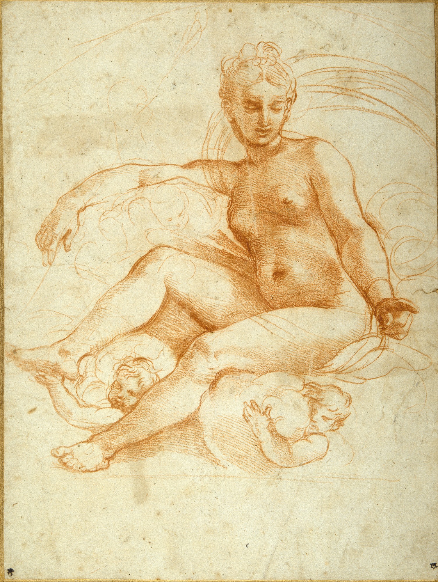 Venus seated on clouds pointing downwards, red chalk on paper (an offset)
