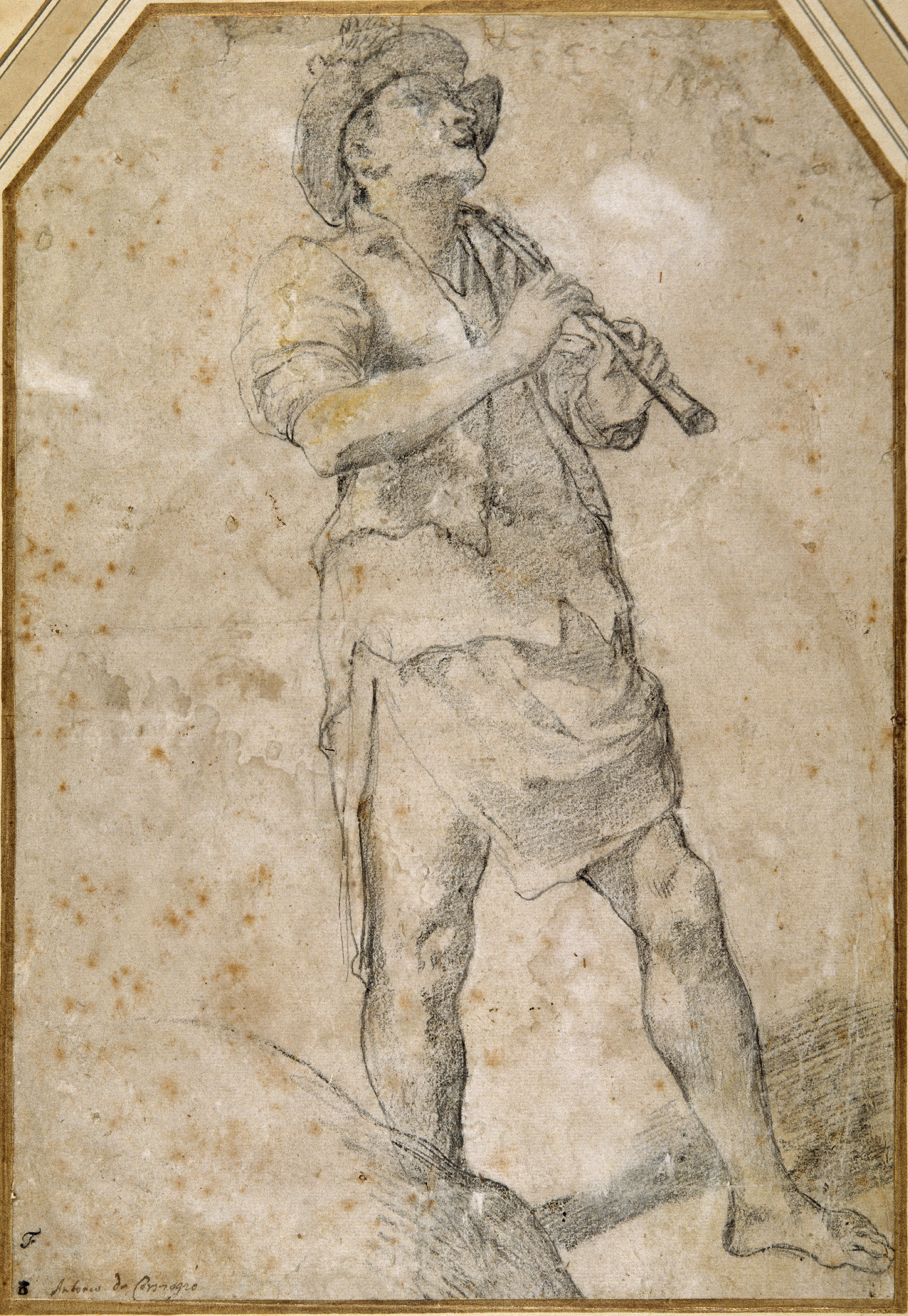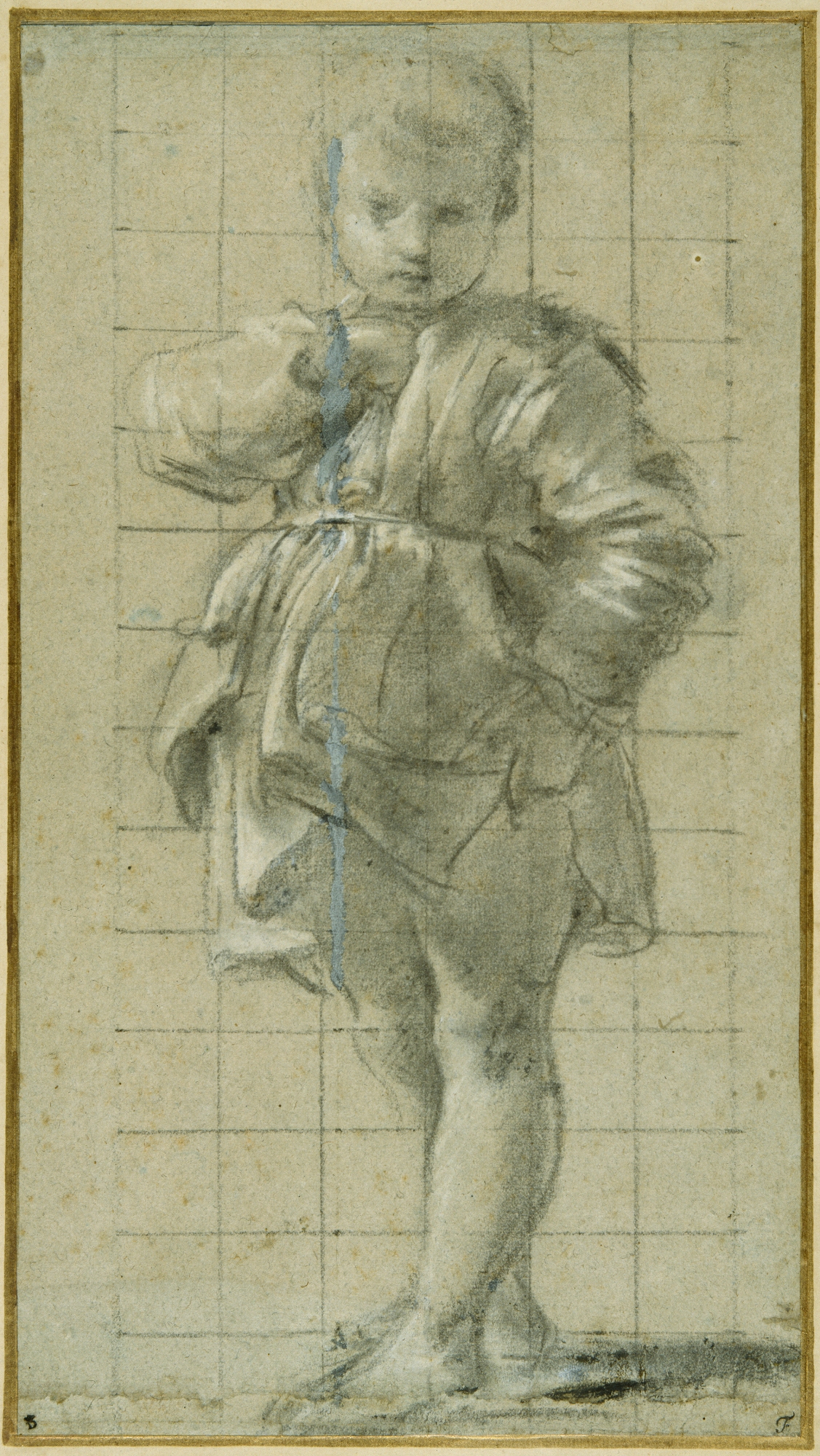 A young boy standing, black chalk, heightened with white, on faded blue paper, squared in black