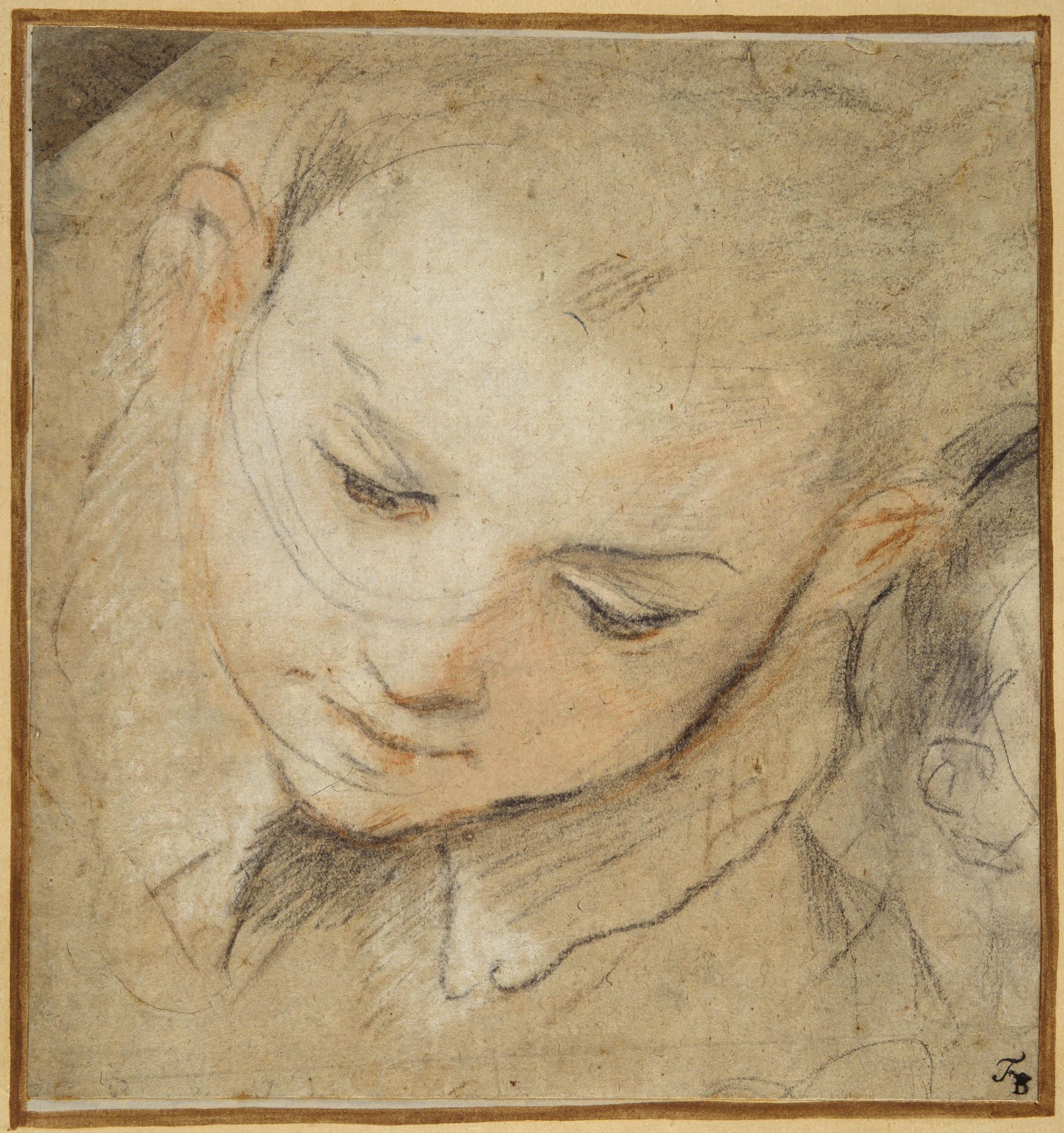 Head of a boy looking down, black, red and white chalks, on faded blue paper
