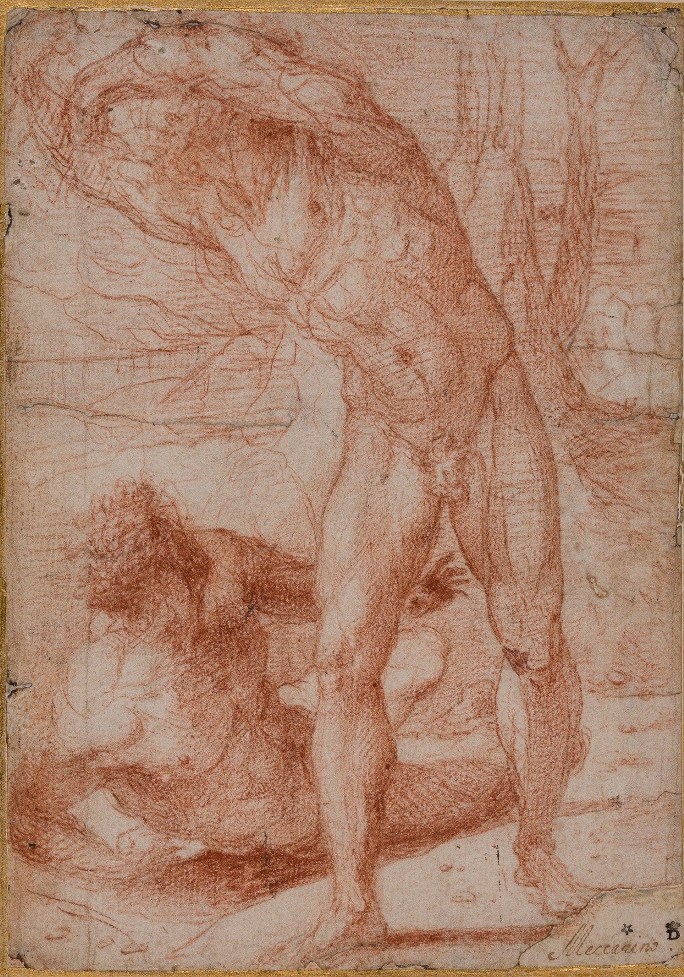 A standing nude and a reclining nude in a landscape, red chalk on paper
