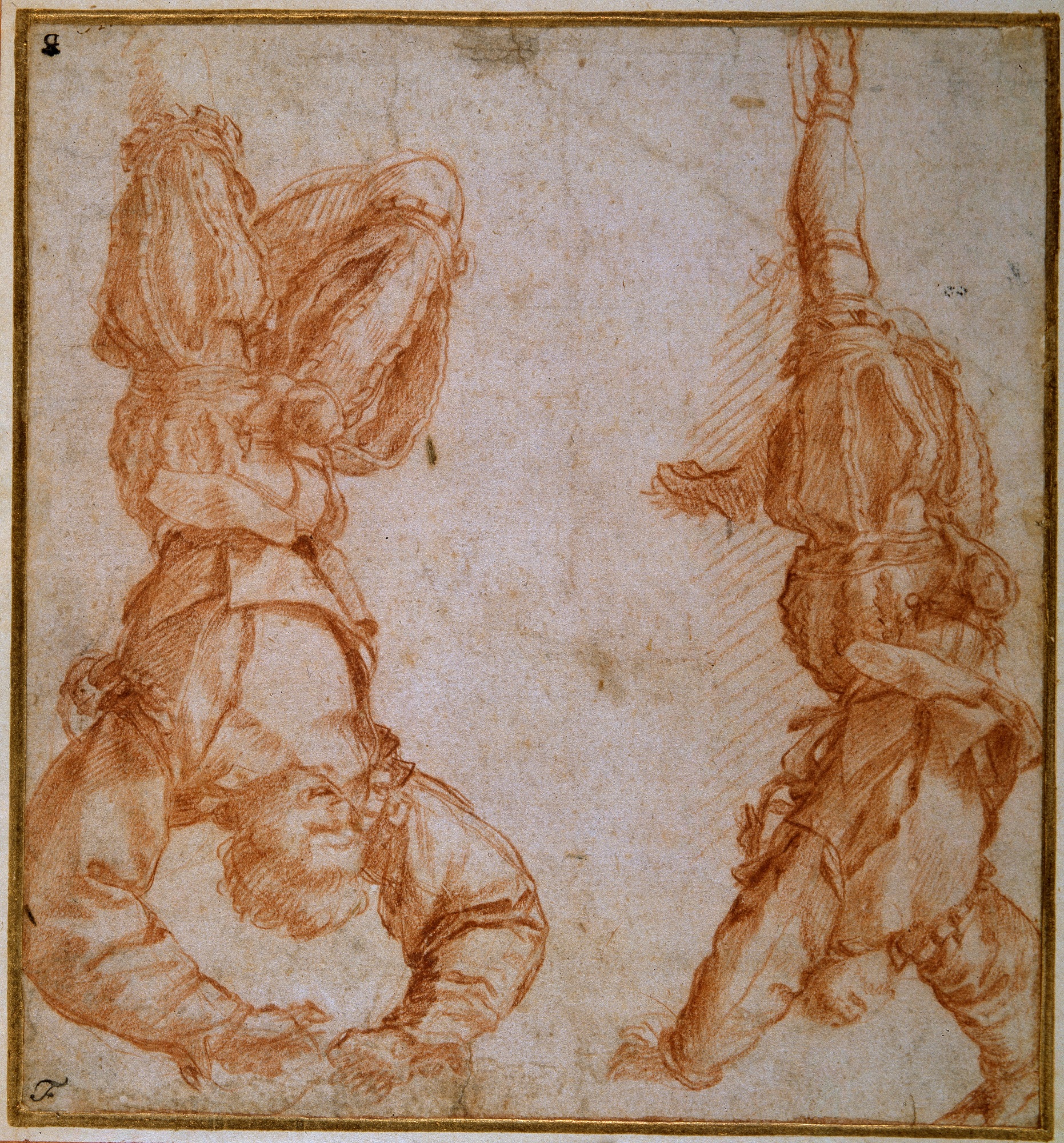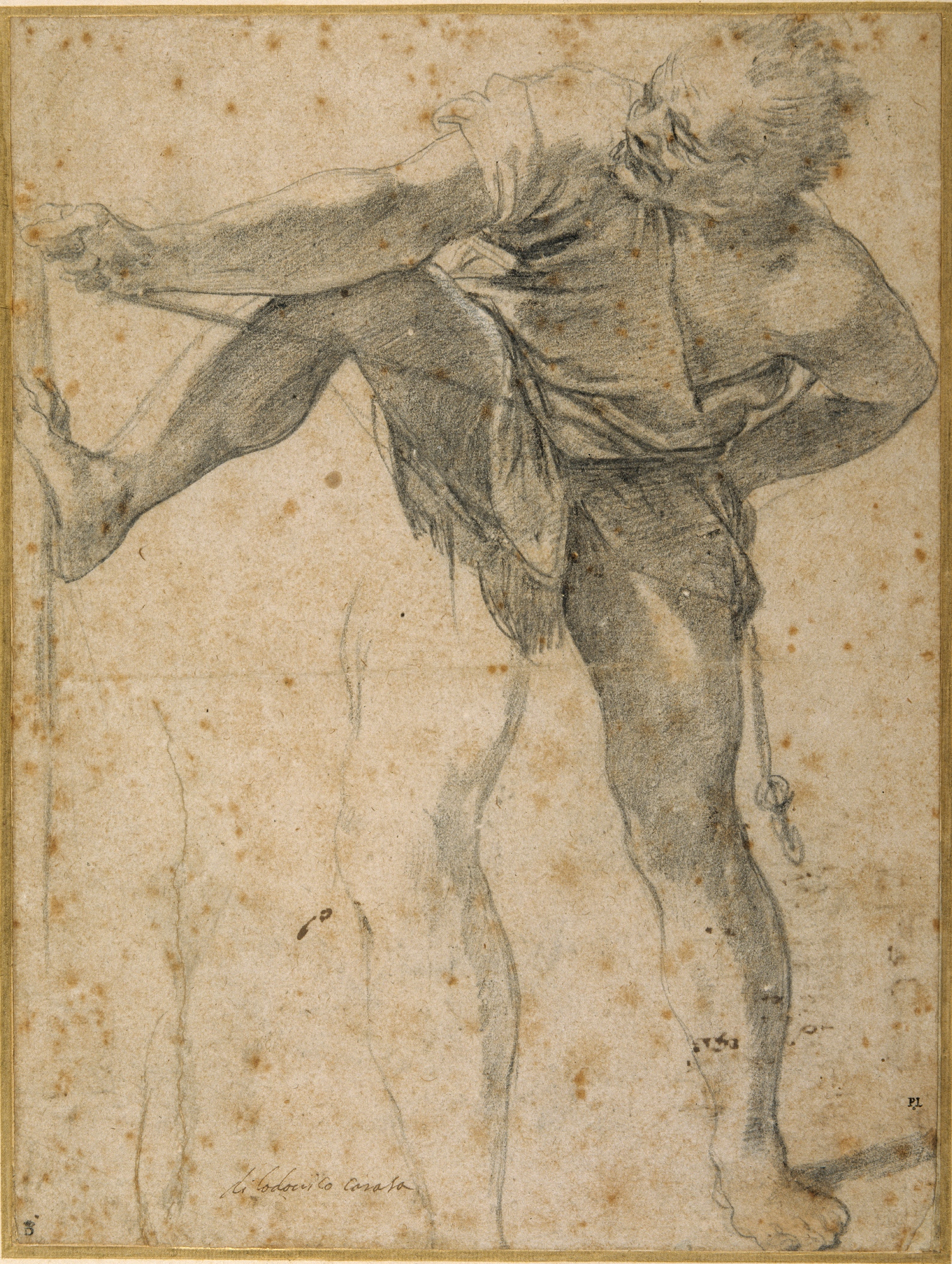 Man pulling on a rope, his left leg rehearsed a second time, black chalk on paper