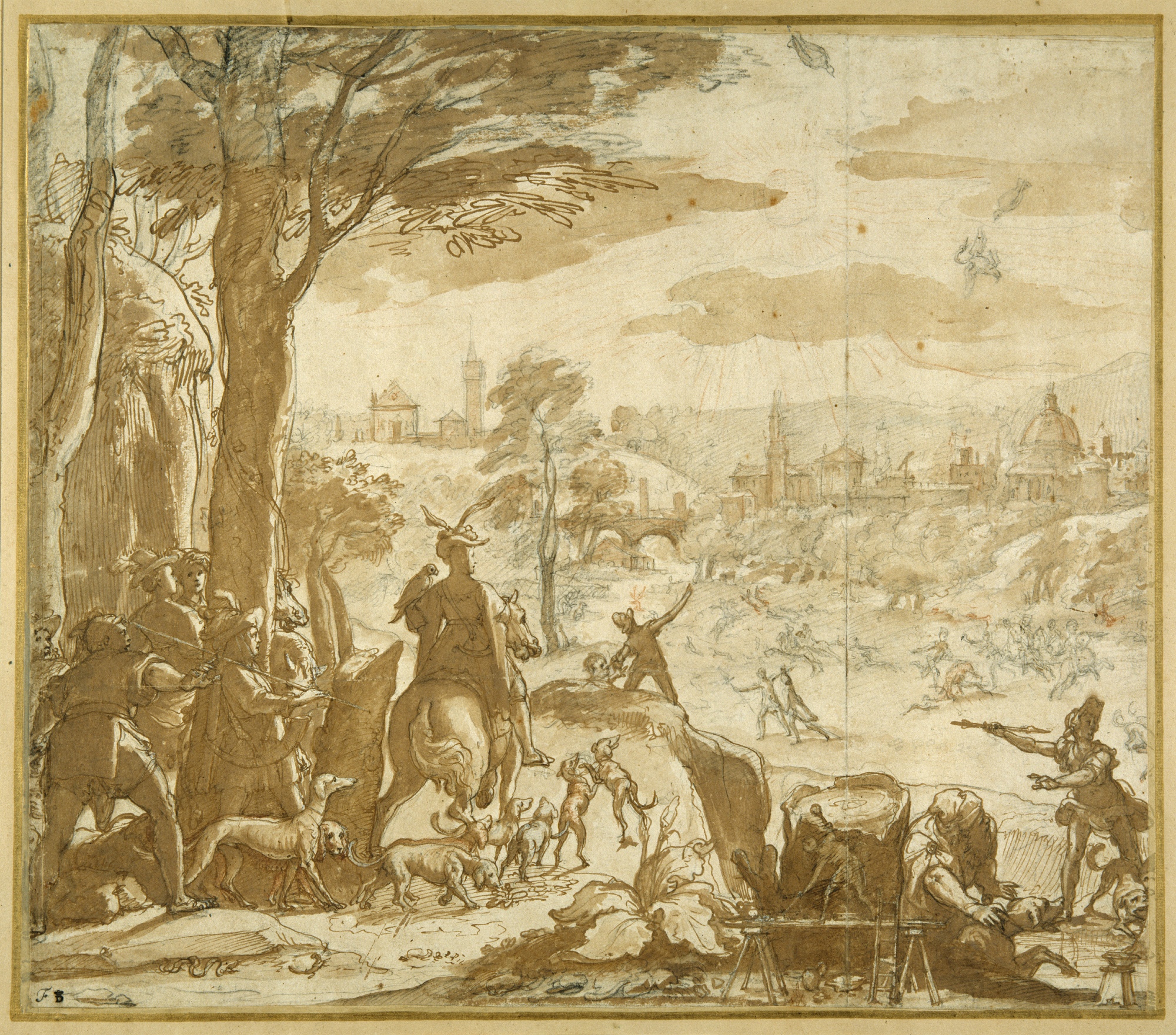 A falconry scene: the combat of a hawk and a heron, pen and brown ink over preliminaries in black chalk and some red chalk, with brown wash and white heightening on paper