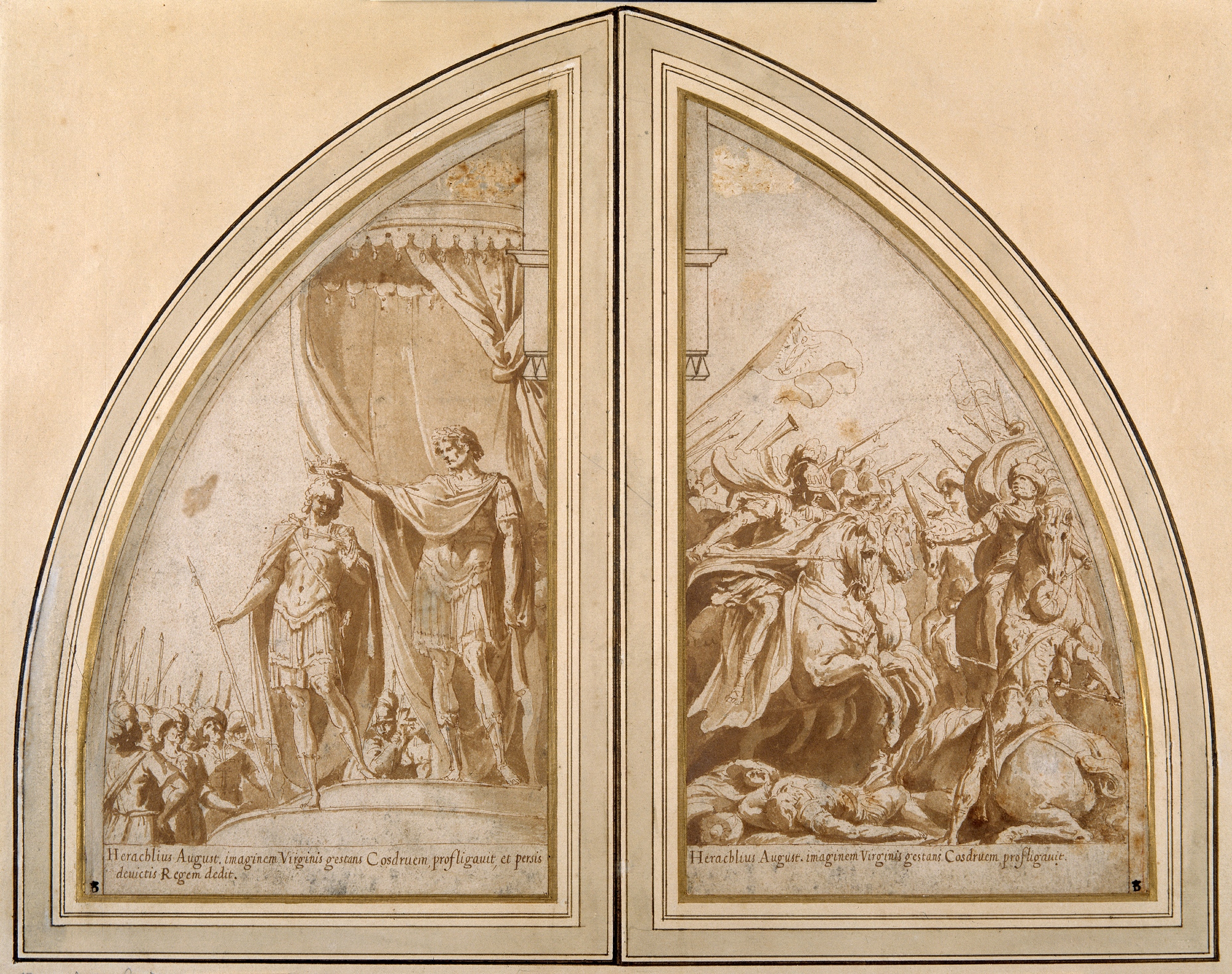 Design for two half-lunettes with the story of Heraclius Victorious over Chosroes, pen and brown ink with brown wash on paper