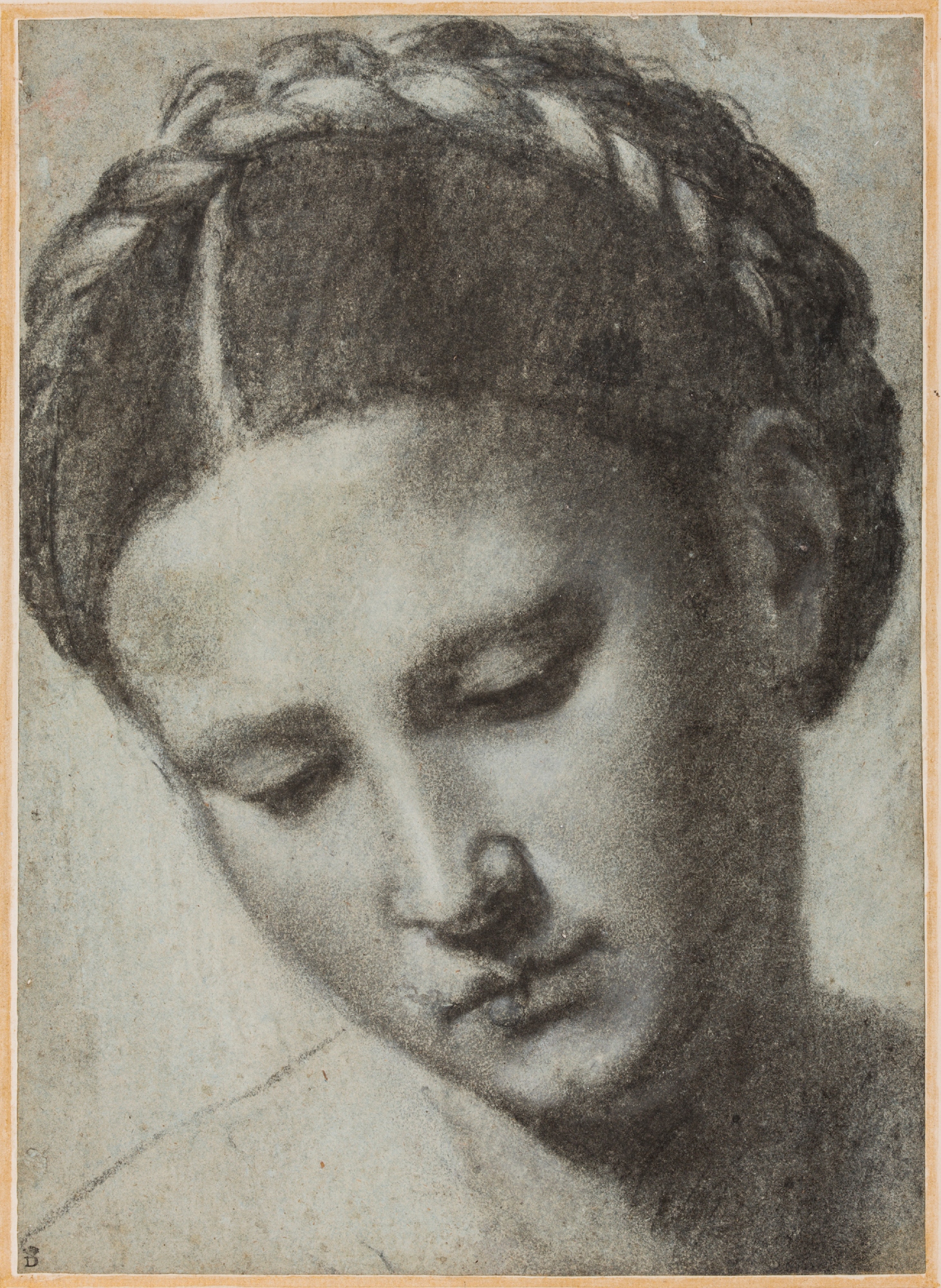 A woman's head with braided hair, charcoal touched with white chalk, on blue paper