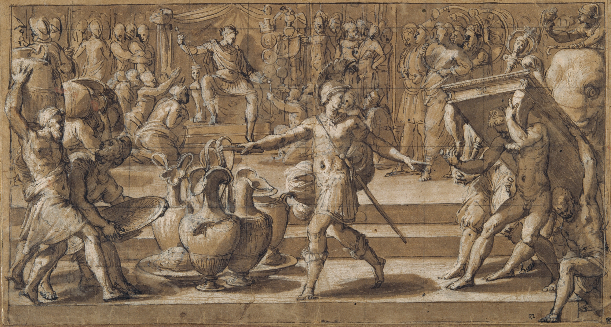 Roman soldiers bringing the spoils of war to lay before Caesar, pen and brown ink with brown wash, heightened with white body colour on brown washed paper, squared for enlargement in black chalk