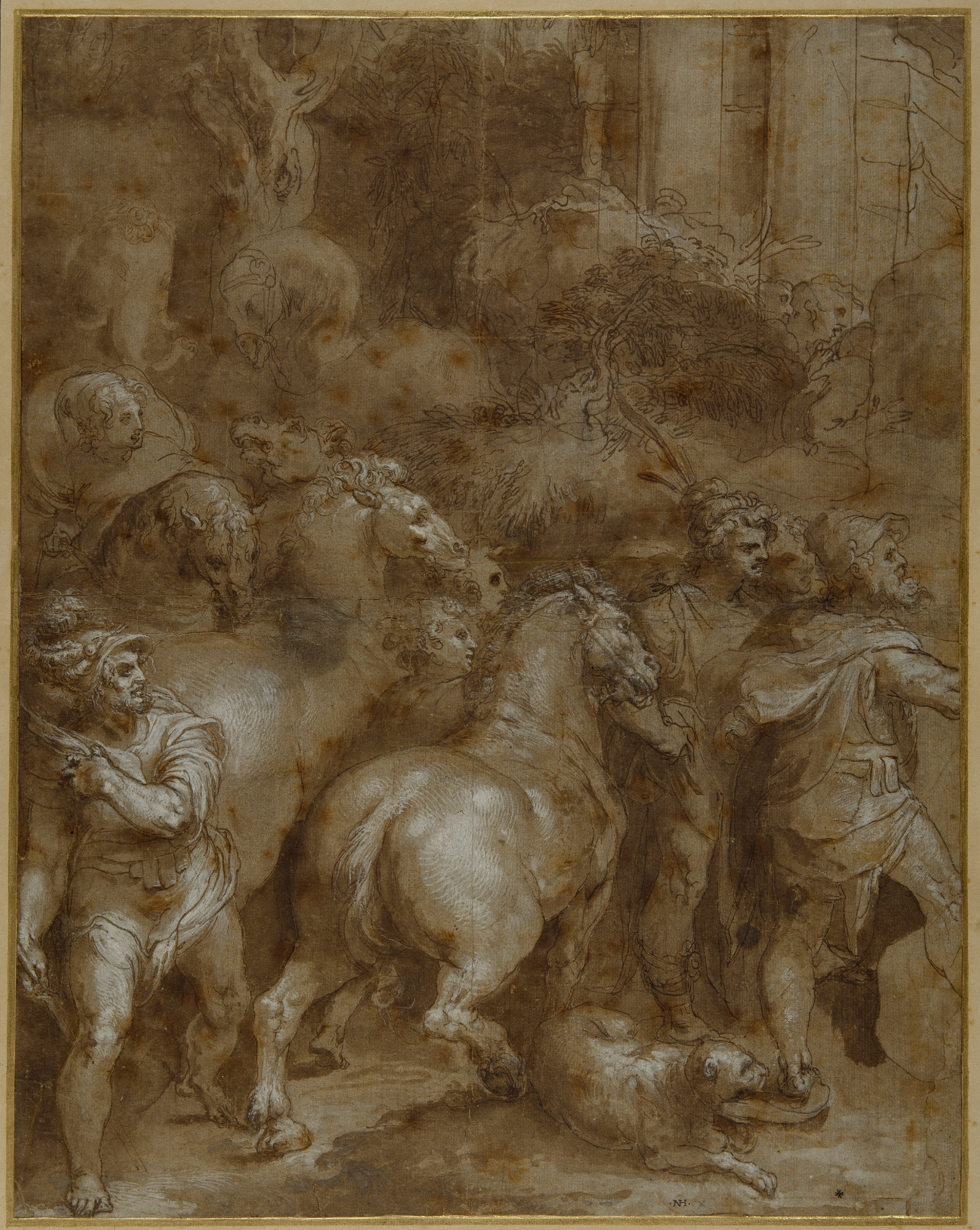 Horses and men, facing right, pen and brown ink with brown wash, with white body colour, on washed brown paper