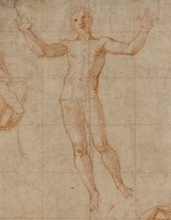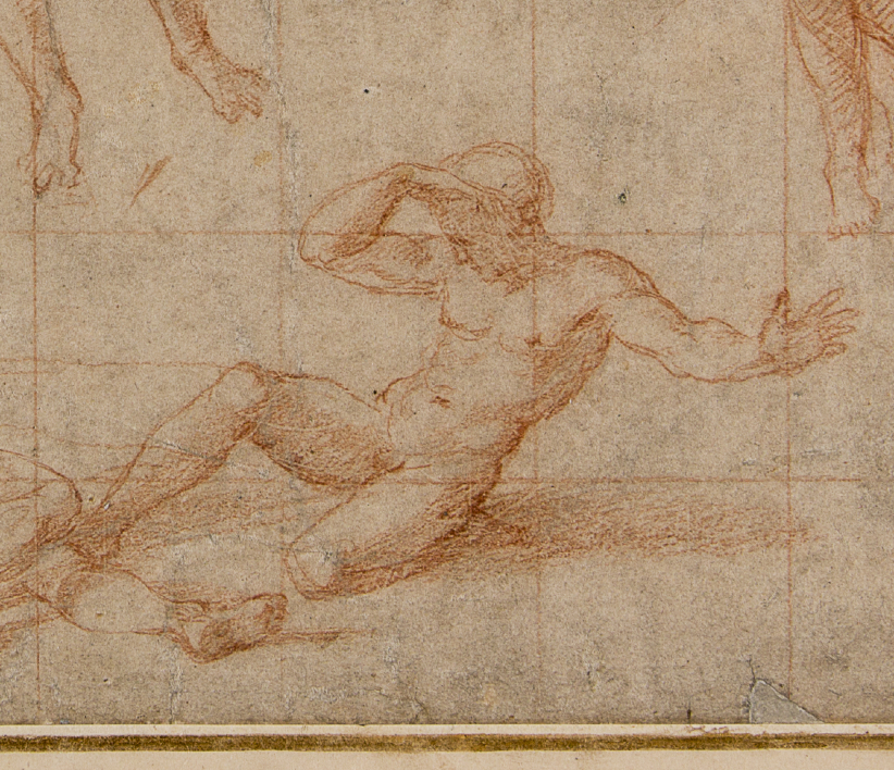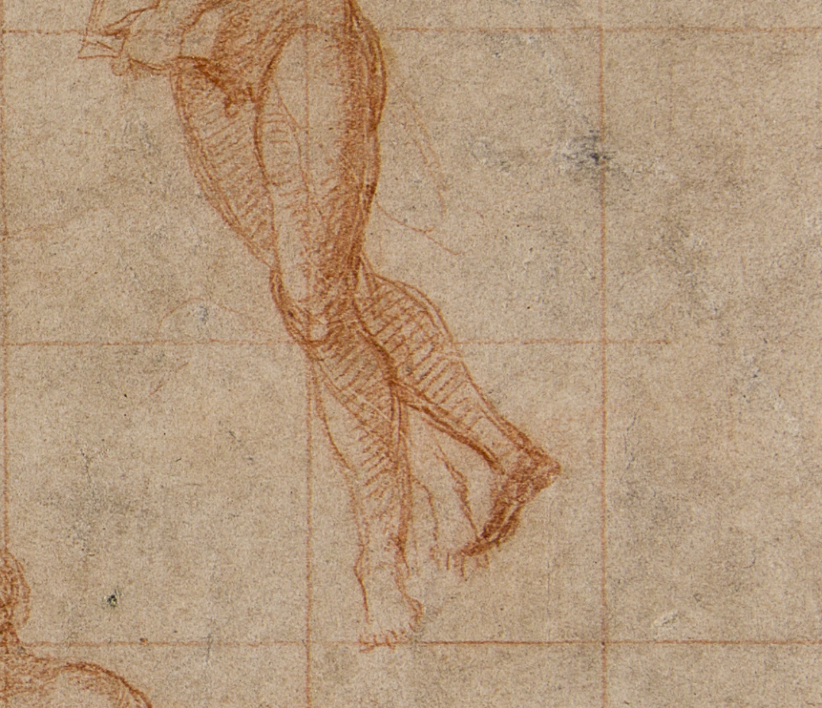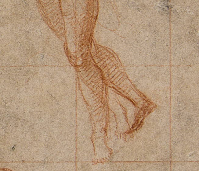 This is usually described as a red chalk drawing. Some of us might think that the material looks more brown than red; it certainly has a rich earth-like quality. Red chalk is a natural material – a hard kind of clay. It is versatile and warm and perhaps it’s easy to see why artists liked to use it when making studies of the naked human figure. It’s possible to use chalk to create the hard line of an accentuated bone but also to suggest the softness of flesh over skeletal structure. Looking at this detail of the lower legs of the man on the right of the drawing, notice how Raphael creates the linear outline of the calf and shin, the softer smudged shadow rounding out the thigh and a series of parallel hatched lines up the calf to suggest volume.