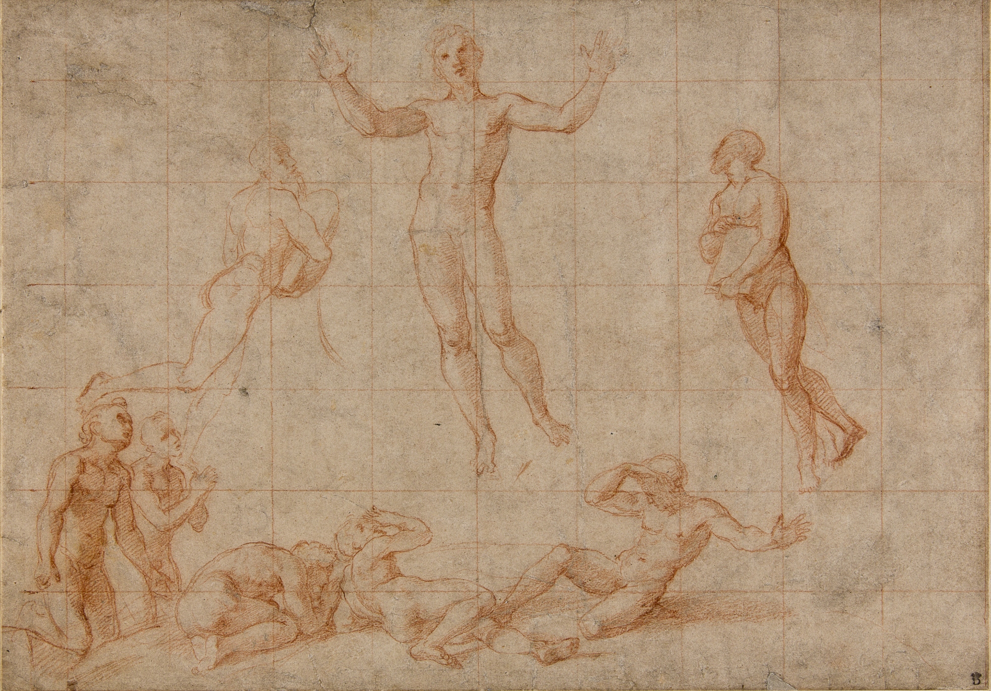 This drawing is a study for the last painting Raphael made before he died at the young age of 37. A close look reveals a number of ways in which Raphael used drawing as part of his creative process.