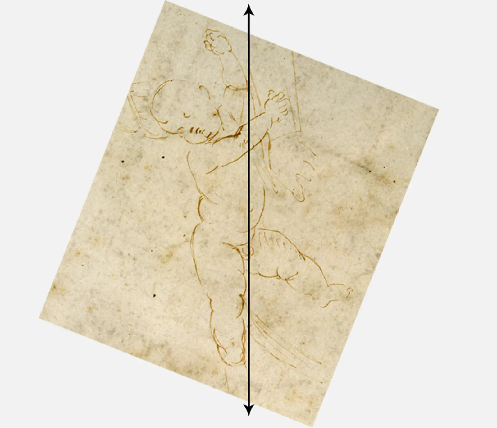 The shorter, curved lines of the infant’s head carry through the rest of his body, rolling down his chubby back, waist and extended thigh and calf of his right leg, which stretches straight out behind him. Follow the line of this leg back up through the body and it naturally extends along the left arm. In spite of the visual liveliness, there is a strong centre of gravity through the axis running the length of this pose.