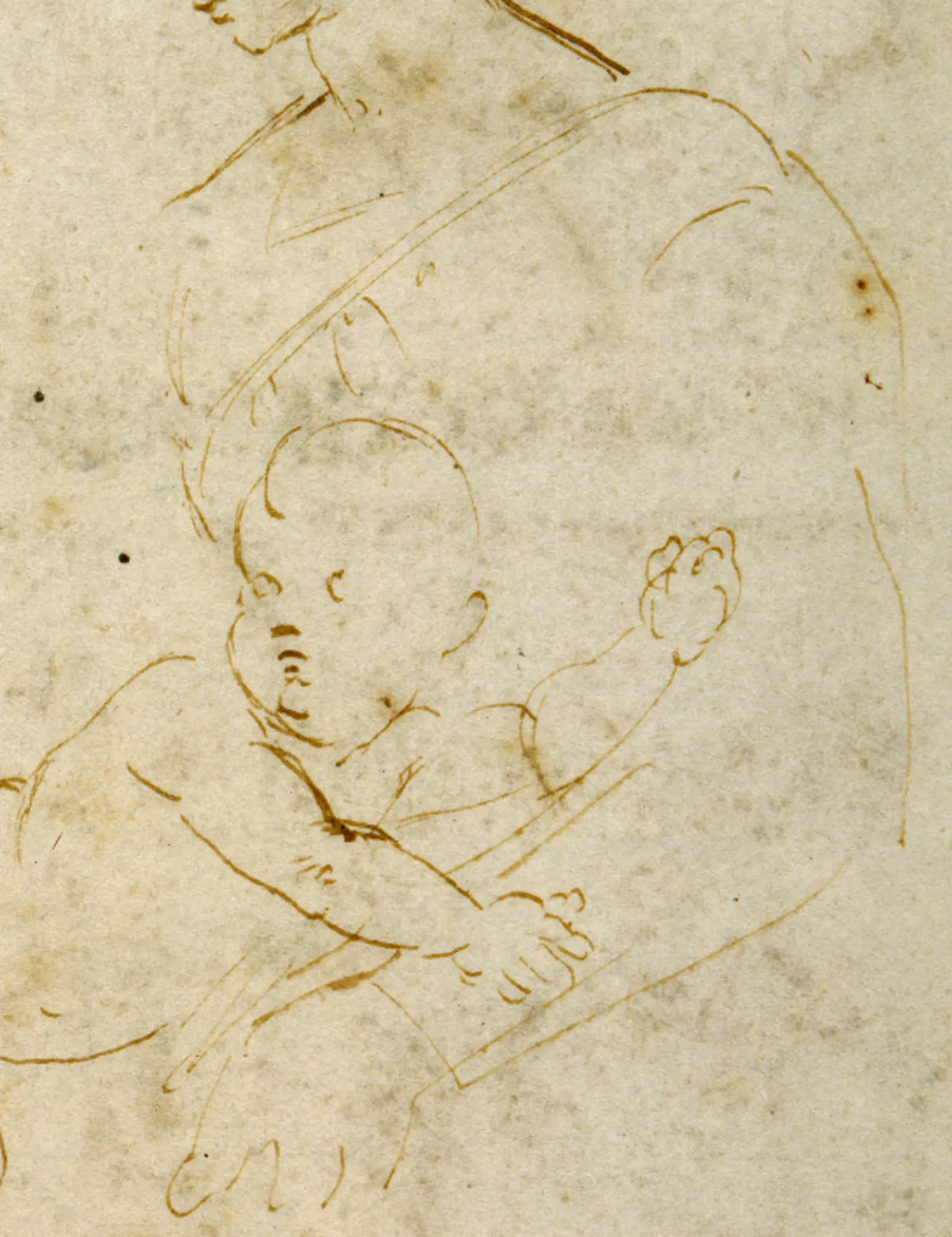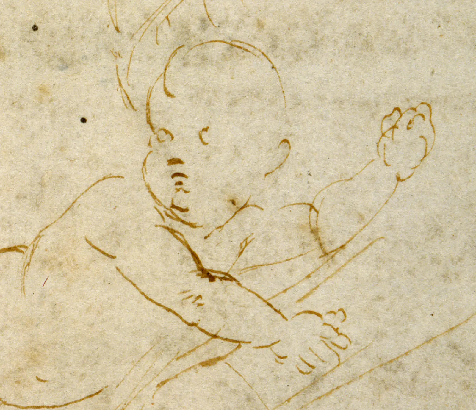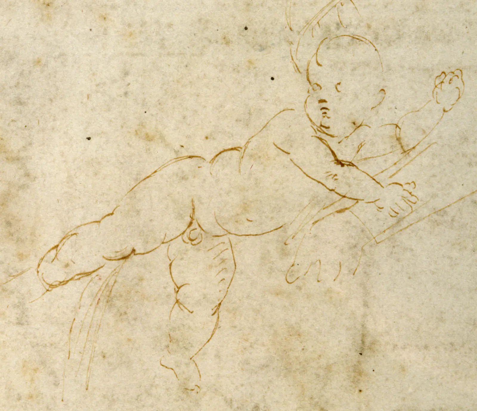 One major distinction between Michelangelo’s sculpture and Raphael’s drawing is the inclusion in the sculpture of a third figure, the infant John the Baptist. This might, in part, explain Raphael’s decision to change the child’s pose and show us how he has borrowed an idea and developed it into his own design.