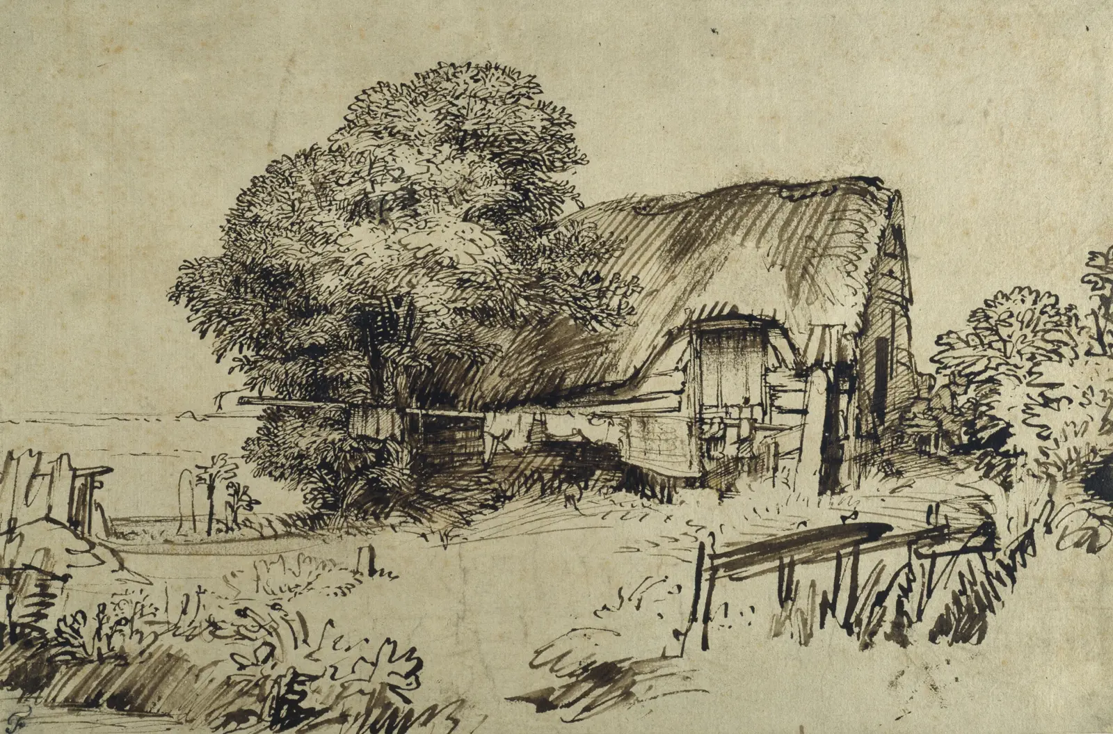 Images: Rembrandt van Rijn drawings: Bend in the Amstel near Kostverloren House; View of Sloten; A thatched cottage by a large tree, a figure seated outside