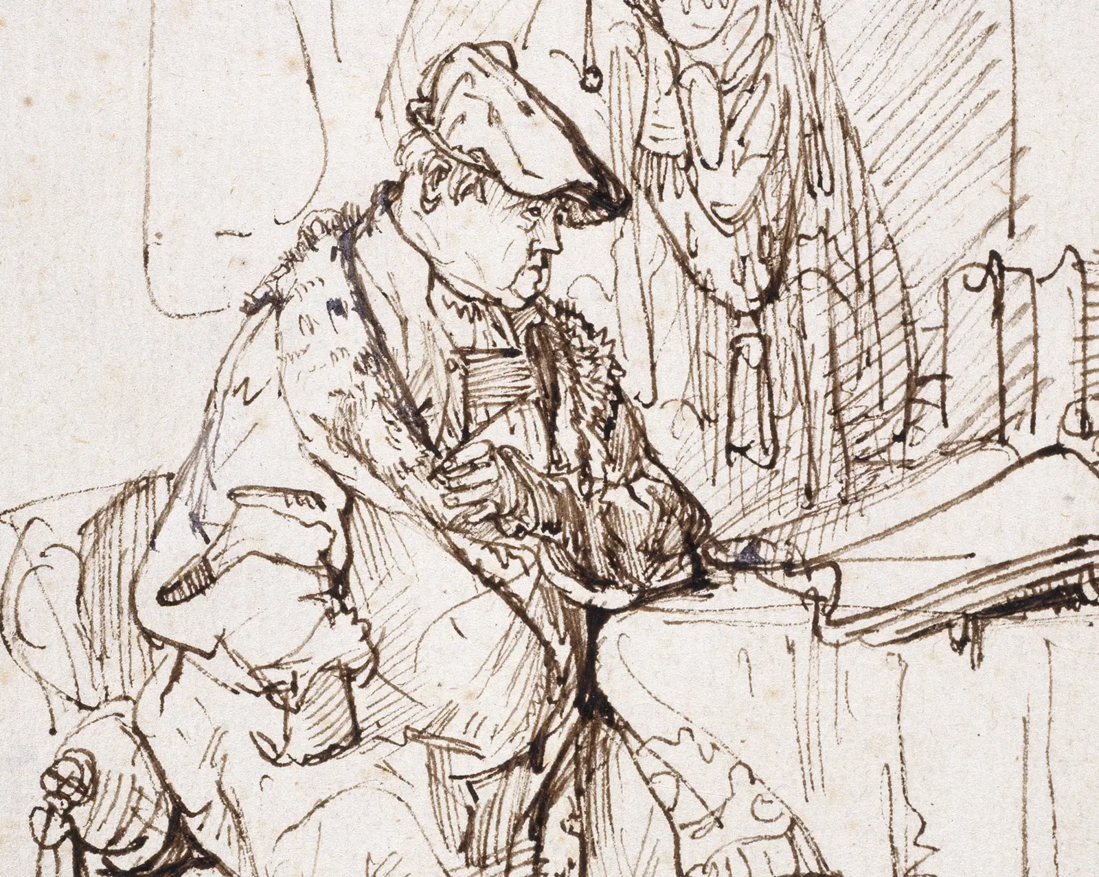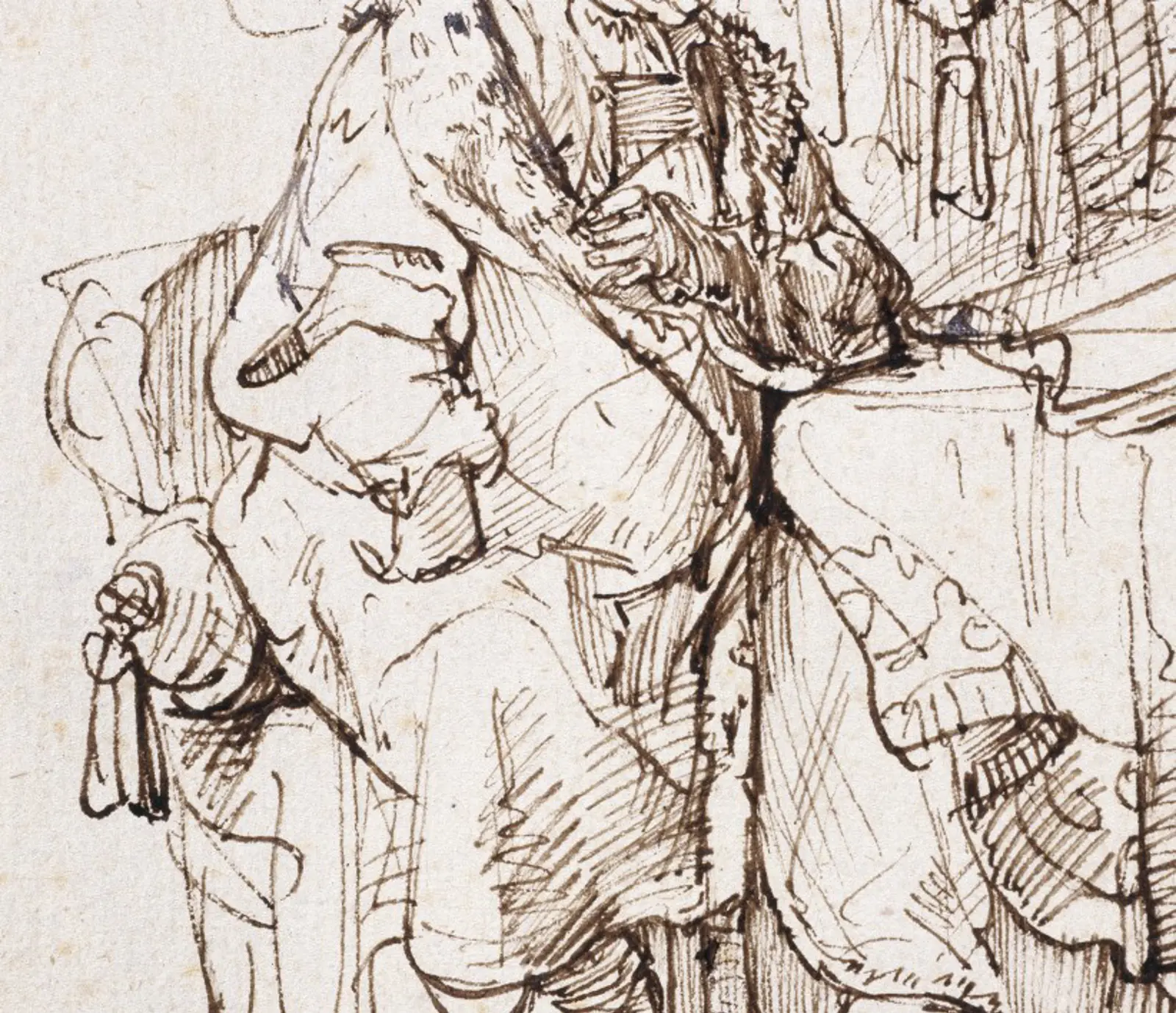 Rembrandt’s handling of pen and ink are electrifying. The assured parallel hatching of the actor’s right hand and across the fabric covering his right shin almost resemble the vital life signs of a cardiogram. The possibility of movement at any moment is rife. With the physical energy of flicking his wrist, Rembrandt has animated this flat surface.