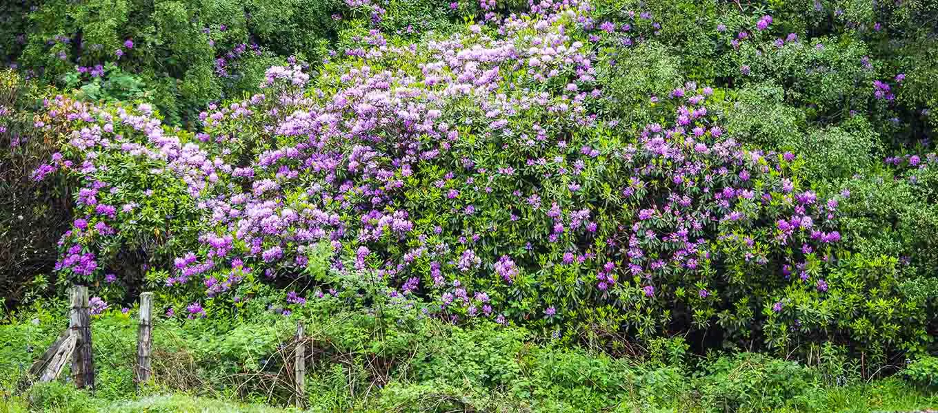 Native to the Mediterranean and Asia, Rhododendron ponticum was introduced to the UK in the 19th century due to its beautiful spring flowers, and because it provides excellent cover for game birds. Compared to other species of the Rhododendron family, ponticum is highly invasive; it spreads through an abundant production of seeds and via its stems which root when they touch the soil. The plant can live for decades, if not longer, and is incredibly hardy.
