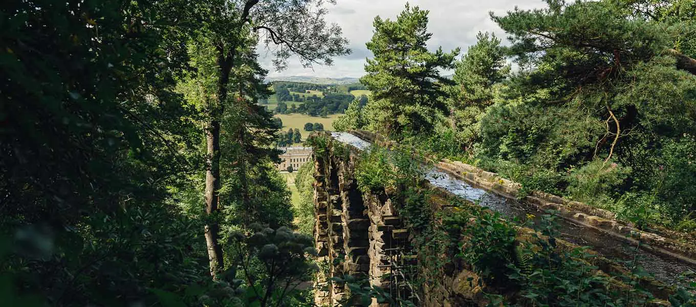 The water features in Chatsworth Garden are fed by a series of streams that channel rainfall off the moors behind the house. The water flows into the Emperor Lake and Ring Pond, down the hillside through Stand Wood and the aqueduct, through the garden, and then into the river Derwent.