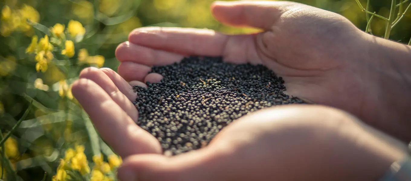 After the flower has died off and the seed pod has hardened it is then time for combining. The combine separates the tiny black seeds which are then dried and stored ready for pressing. After the pressing process, the by-product or husk is fed back to the cattle so there is absolutely no wastage.