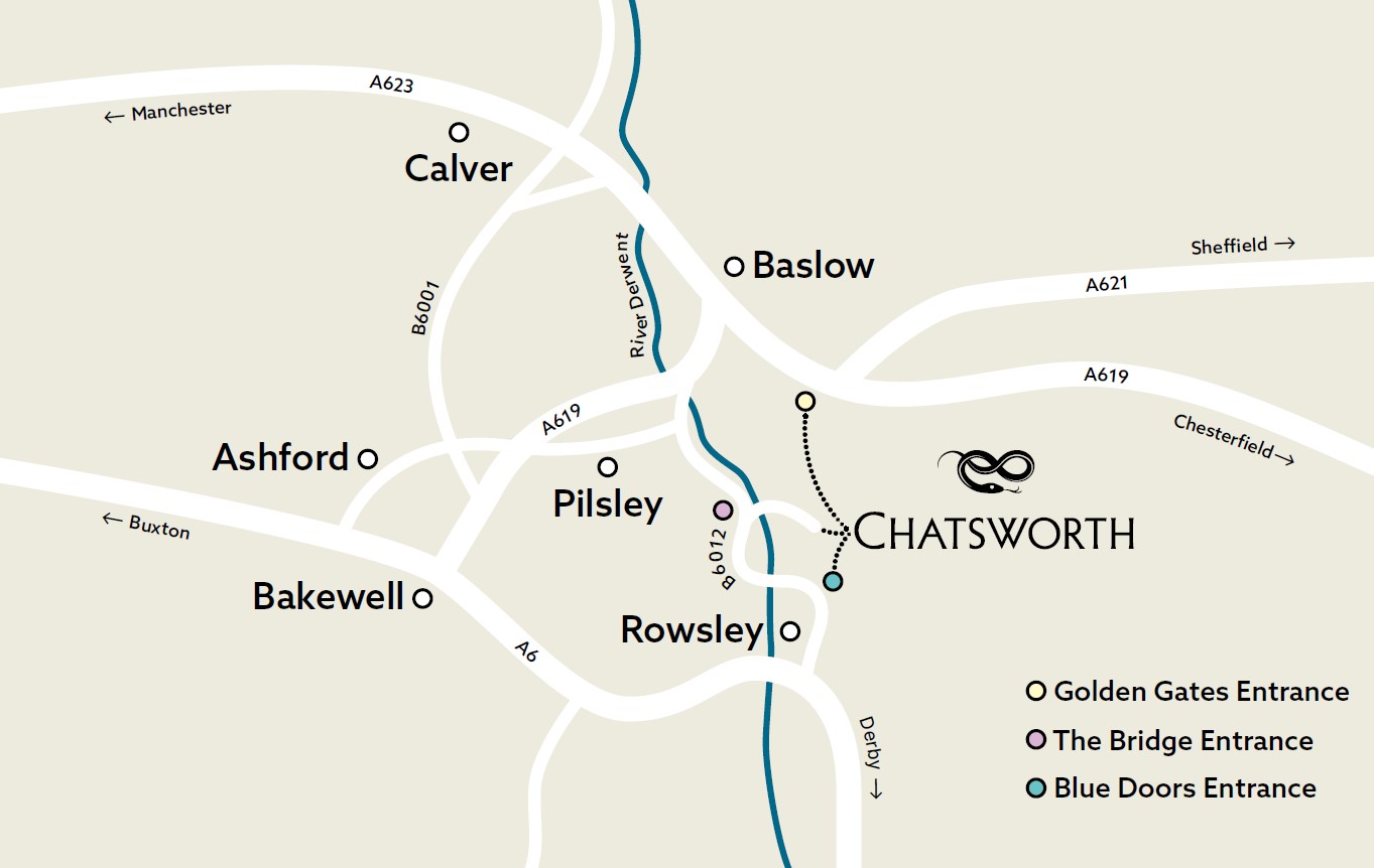 Chatsworth is 8 miles north of Matlock off the B6012. It is 16 miles from the M1 junction 29, signposted via Chesterfield and 42 miles from the M6 junction 19.