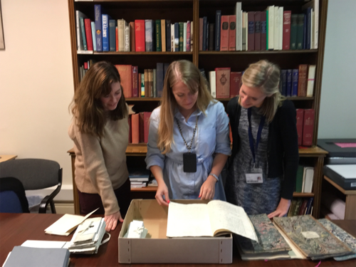 From left to right: Fiona Clapperton, Lauren Butler and Hannah Wallace, PhD students from the University of Sheffield looking at an account book at Chatsworth