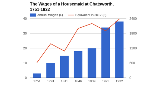 This graph shows the wages of a housemaid at Chatsworth, excluding board wages and other allowances, at unequal intervals between 1751 and 1932. While the payments consistently rose, the value was affected by inflation, in particular during events such as the Napoleonic Wars (1803-1815) and the First World War (1914-1918).