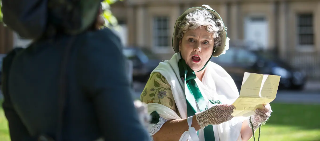 A comedic promenade performance featuring favourite characters from Jane Austen's world, taking place in the Chatsworth Garden and performed by The Natural Theatre Company.