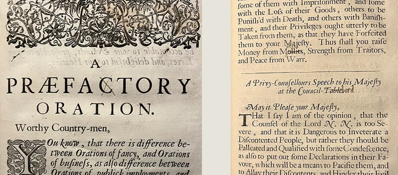 Images from Margaret Cavendish’s ‘Orations’, 1662. From left to right, p.4 and p.6.