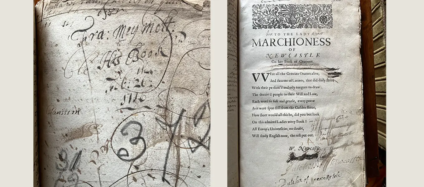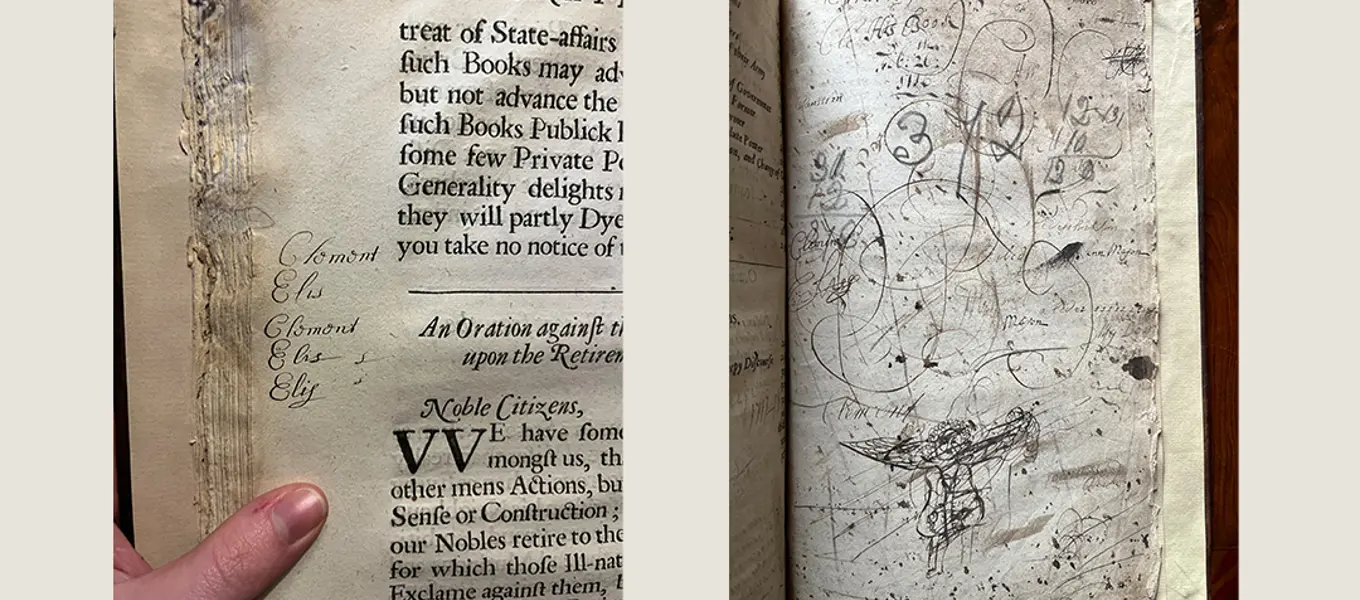 Images from Margaret Cavendish’s ‘Orations’, 1662. From left to right, p.66 showing “Clement Elis” written in the margin; then a back page, heavily written on. Clement Ellis’s name is visible on the mid-left, but “Clement” is also written above what appears to be a drawing of an angel.