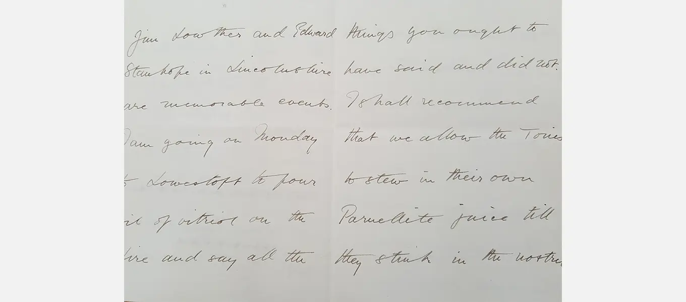 After learning Lord Salisbury’s Conservative Party had lost the Lowestoft seat to the Liberal Party, Lord Harcourt writes that he “shall recommend that we allow the Tories to stew in their own Parnellite juice till they stink in the nostrils of the country and then we will fling them, dishonoured and disgraced to the constituencies and make an end of Toryism for a generation”. He also added that he was going to Lowestoft himself to “pour oil of vitriol on the fire”, something he believed Hartington should have done himself.