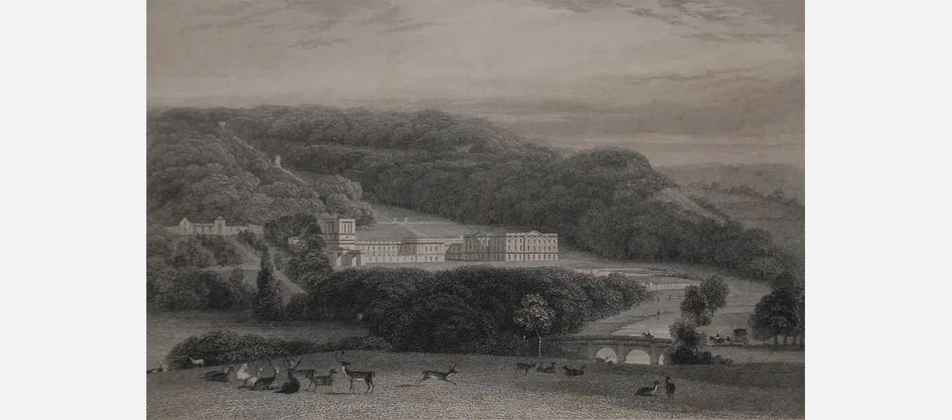 An engraving of Chatsworth which was published in 1833 that represents Chatsworth as it might have looked when Charles Morgan visited.
